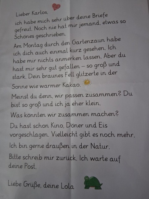 Liebe Leser, stellt euch vor, das Klassentier der Klasse 1c, die Schildkröte Karlos, hat sich verliebt. Als sie am Wochenende bei Frau Bellemann war, hat sie durch den Gartenzaun Lola, die…