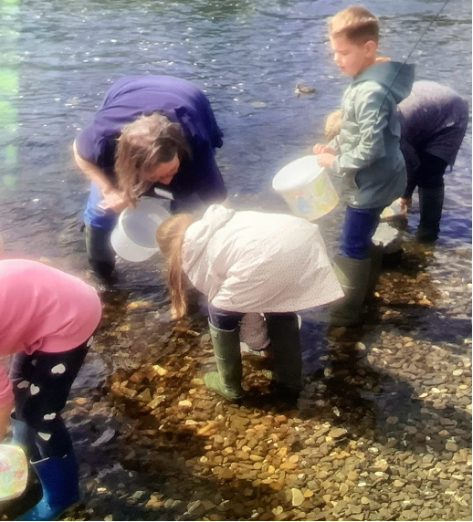 Dann sind wir mit den Eimern und geliehenen Gummistiefeln in die Sieg gegangen und haben die Eimer vorsichtig seitlich ins Wasser getaucht. Dann konnten die kleinen Fische heraus schwimmen. Wir mussten gut aufpassen, dass uns kein Wasser in die Gummistiefel schwappt.