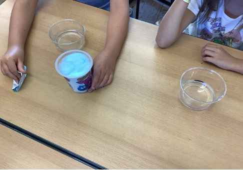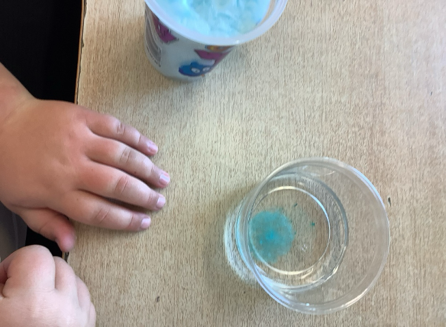 Wir geben einen „Wattebausch“ Zuckerwatte in einen mit Wasser gefüllten Becher. Die