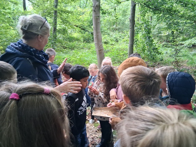 Um tief in den Wald zu kommen, mussten alle Kinder über einen Bach springen. Im Wald gab es verschiedene Bäume: die Eiche, Fichte, Birke, Ahorn, Buche und Kiefer. Mit einem Lupenbecher konnten wir verschiedene Tiere sehen, zum Beispiel Käfer, einen Molch, Frösche und Spinnen. Später haben wir gegessen und danach frei gespielt. Am Ende mussten wir wieder zur Schule gehen.