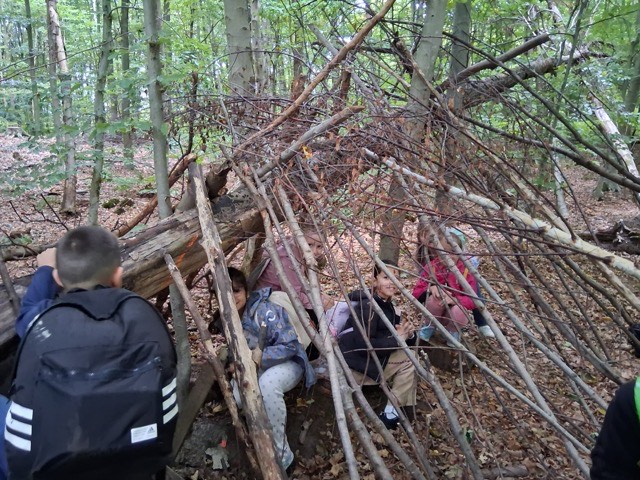 Im Wald haben wir einen umgestürzten Baum gesehen. Dahinter lagen viele kleine Holzstücke, mit denen wir gebaut haben. Eine Höhle haben wir auch gefunden. Wir haben ganz viel über den Wald gelernt, zum Beispiel ,dass Blätter Münder haben, mit denen sie Wasser trinken.
